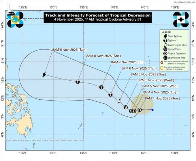 PAGASA cho biết áp thấp nhiệt đới này sẽ tiếp tục mạnh lên trên vùng biển phía đông Philippines trong suốt thời gian dự báo.